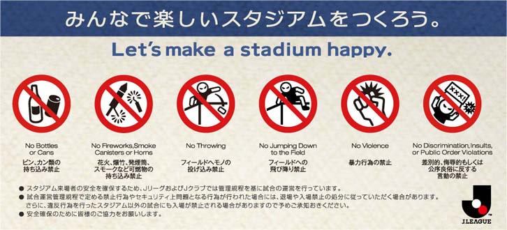 リーグは、安全で快適なスタジアムづくりを目指して、ピッチ上の選手たちだけではなく、来場者に対しても、試合の雰囲気を盛り上げるような、フェアな応援をお願いしたいと考えています。